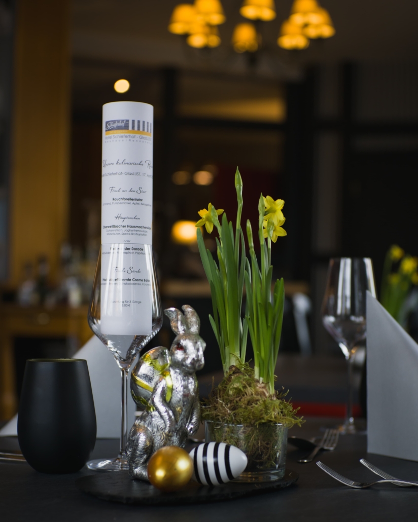 österliche Vorspeisen, die Suppe mit Liebe gewürzt, die Hauptspeisen von Fisch, Fleisch bis Vegetarisch, Desserts und Käse sündhaft lecker! inkl. Osterwasser
